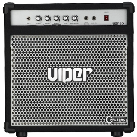 CARLSBRO VIPER 30. Kompaktowe combo basowe o mocy 20Watt. Przedwzmacniacz wyposażony jest w 3-pasmowy korektor. 10-calowy głośnik basowy Carlsbro Powertone. Posiada wejście odtwarzacza MP3/CD i wyjście słuchawkowe. Technologia: półprzewodnikowa. Jeden kanał. Wejście gitarowe 6,3 mm; Wejście CD/audio 6,3 mm. Wyjścia: słuchawkowe 6,3 mm. Sterowanie: Volume. Korekcja: Bass/Middle/Treble. Efekty: Compressor. Impedancja: 4 ohm. Wymiary: [HWD]: 525mm x 460mm x 505mm. Waga: 22 kg.Potrzebujesz pomocy? Masz pytania?Zadaj pytanie a my odpowiemy niezwłocznie, najciekawsze pytania i odpowiedzi publikując dla innych.