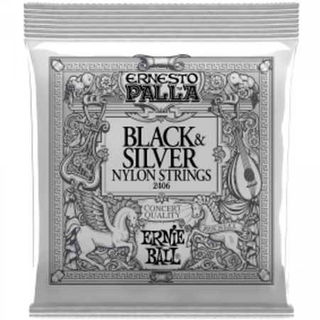 NYLON BLACK & SILVER Zestaw 6 strun do gitary klasycznej z serii ERNESTO PALLA NYLON CLASSICAL. Struny wiolinowe z czarnego nylonu, struny basowe z nylonu powlekanego srebrem. Grubości: .028 .032 .040 .030 .036 .042