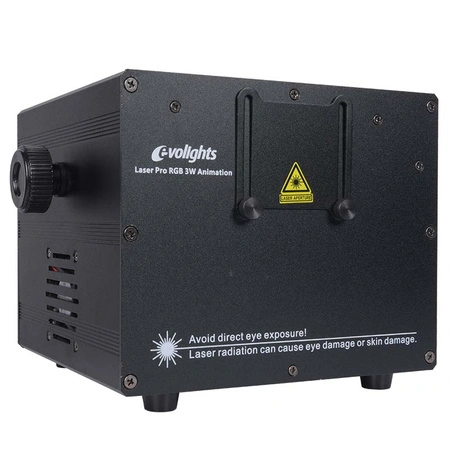 - EVOLIGHTS LASER PRO RGB 3W ANIMATION V2 sceniczny – EVOLIGHTS LASER PRO RGB 3W ANIMATION V2 to profesjonalny, bardzo mocny sceniczny efekt wietny w postaci lasera animacyjnego, wyposażony w komputerowe wejście i wyjście ILDA. Projektor emituje wi
