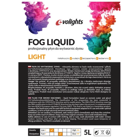 - EVOLIGHTS płyn do wytwornicy dymu lekki LIGHT 5L – Pyn wyprodukowany we Francji Made in Europe, przez wiodącego producenta płynów na świecie. EVOLIGHTS FOG LIQUID LIGHT profesjonalny płyn do wytwornic dymu płyn do wytwornic