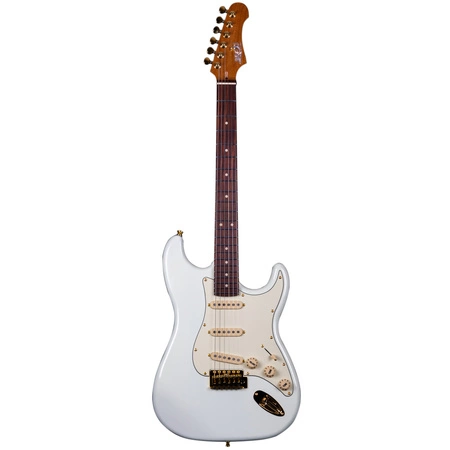 GITARA ELEKTRYCZNASeria JS 380 to linia gitar inspirowanych modelem Stratocaster oferująca klasyczne brzmienie dzięki układowi przetworników SSS. Jest wyposażona w 5-pozycyjny przełącznik oraz potencjometry do regulacji głośności i tonu, co umożliwia precyzyjną kontrolę brzmienia. Wysoka jakość wykonania, doskonałe brzmienie i ponadczasowy design sprawiają, że jest to doskonały wybór dla muzyków na różnych poziomach zaawansowania. Instrument charakteryzuje się eleganckim wykończeniem ze złotym osprzętem i klasyczną kolorystyką, co dodatkowo przyciąga uwagę i podkreśla jej wyjątkowy styl.SPECYFIKACJAKorpus: Palona TopolaGryf: Kanadyjski palony klonKonstrukcja: Modern ""C""Podstrunnica: PalisanderRadius: 241 mmMenzura: 648 mmProgi: 22Przetworniki: 3x Single Coil Alnico V, Custom modelKontrola: 1x Volume, 2x Tone, 5-pozycyjny przełącznikMostek: TremoloSiodełko: Kość, 42 mmOsprzęt: ZłotyKolor: White