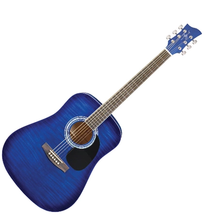 Gitara akustyczna 6-strunowa. Rozmiar: 4/4. Kształt/typ: Dreadnought. Płyta wierzchnia: lipa (Flame Top). Boki i tył: lipa. Gryf: mahoń. Podstrunnica: palisander. Mostek: palisander. Rozeta: Abalone. Maszynki chromowane: Chrome Die-Cast. Wykończenie: połysk. Kolor: transparentny niebieski.