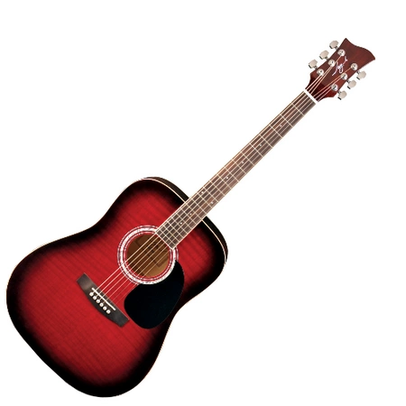 Gitara akustyczna 6-strunowa. Rozmiar: 4/4. Kształt/typ: Dreadnought. Płyta wierzchnia: lipa (Flame Top). Boki i tył: lipa. Gryf: mahoń. Podstrunnica: palisander. Mostek: palisander. Rozeta: Abalone. Maszynki chromowane: Chrome Die-Cast. Wykończenie: połysk. Kolor: czerwony - Red Sunburst.