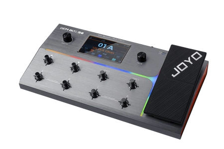 Model Joyo GEM BOX K8 wyróżnia się na tle poprzednich wersji zarówno pod względem funkcjonalności, jak i designu. Jego charakterystycznym elementem jest duży, kolorowy ekran dotykowy, który dzięki nowoczesnemu interfejsowi graficznemu prezentuje wszystkie kluczowe informacje. Zastosowanie panelu dotykowego pozwoliło ograniczyć liczbę fizycznych przycisków – znajdziemy tu jedynie enkoder VALUE oraz pokrętło do regulacji głośności. Dolną część urządzenia zajmuje sekcja ośmiu przełączników nożnych, umożliwiających obsługę różnych funkcji, a całość uzupełnia programowalny pedał ekspresji.
