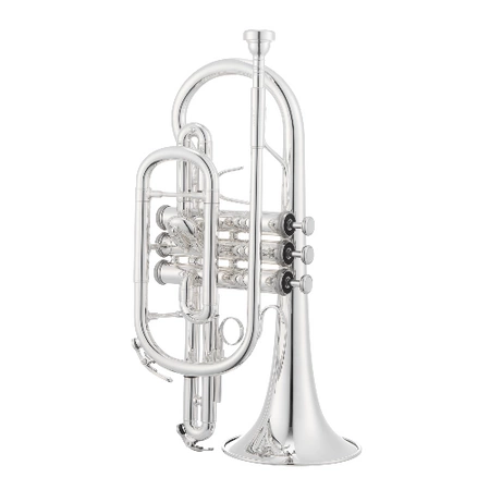 Strój: Bb. Otwór: 11,68 mm. Czara: Ø 120 mm, posrebrzana, mosiądz. Korpus: posrebrzany, mosiężny. Zawory: stal nierdzewna, wewnętrzne sprężyny. Podpórka pod kciuk przy 1 tłoku. Pierścień regulowany przy 3 tłoku. Perłowe inkrustacje na przyciskach. Ustnik. Futerał JUPITER JPKC28Q. Akcesoria.