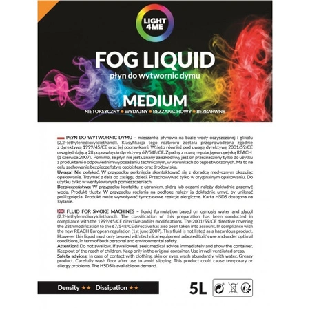 - LIGHT4ME płyn do dymu mgły dymiarki średni 5L – Pyn wyprodukowany we Francji Made in Europe, przez wiodącego producenta płynów na świecie. LIGHT4ME FOG LIQUID MEDIUM profesjonalny płyn do wytwornic dymu płyn do wytwornic mgły po