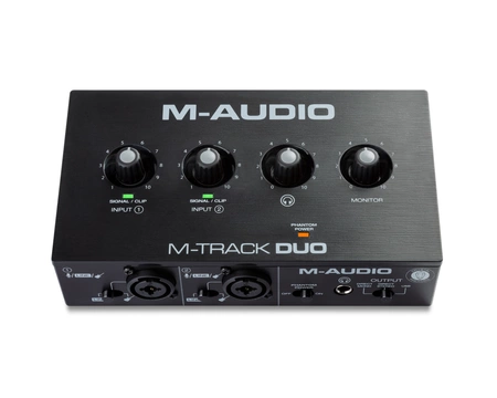 - M-Audio MA MTRACK DUO — Interfejs Audio USB [2 IN/ 2 OUT] 16-bitów/48kHz, 2 wejście combo [XLR/TRS] mikrofonowo-instrumentalne [preampy Crystal z Phantom], 2 wyjściaTRS,wyjściesłuchawkowe,przełącznikUSB/Direct,MPCBeats,AIR Electric, Bassline i TubeSynth,