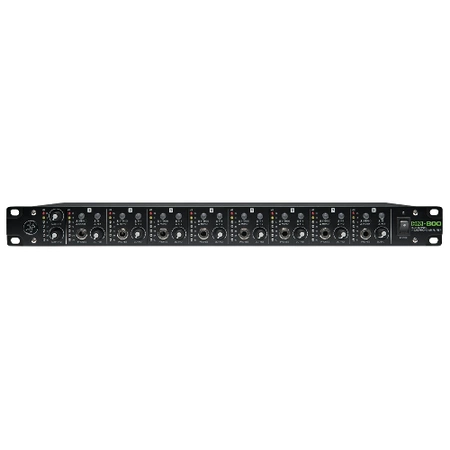 Ośmiokanałowy wzmacniacz słuchawkowy HM-800 jest wyposażony w aż dwa wyjścia słuchawkowe na każdy kanał. W każdym kanale udostępniono regulację poziomu sygnału, a także możliwość przełączania się pomiędzy trybami MONO/STEREO oraz po dwie pary wejść i wyjść MAIN typu jack 1/4” i osiem wejść AUX tego samego typu. Wszystko zamknięte w wytrzymałej, rackowej obudowie. Gniazda: 16 x Jack 1/4'' 7-segmentowy panel LED. Solidna metalowa obudowa typu rack