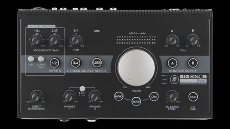 - Mackie MACKIE BIG KNOB STUDIO — Kontroler monitorów i interfejs audio USB 2x4 (24-bit/192 kHz), 4 wej. źródłowe, 3 pary wyj. monitorów TRS, 2 przedwzmacniacze Onyx z phantom 48V, talkback, cue mix bez latencji, 2 wyj. słuchawkowe z niezależnym poziomem, w