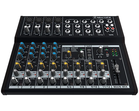 - Mackie MACKIE MIX12FX — 12-kanałowy mikser, 4x XLR, 4x mono, 4x stereo 1/4in., 1x RCA in/out, 3-pasmowy EQ, HPF 75 Hz, 12 FX, zasilanie phantom 48V, wyjścia: stereo TRS, control room, RCA, FX Send, pasmo 20 Hz – 30 kHz, THD+N < 0.25%, SNR > 85 dB, 1.7 kg,