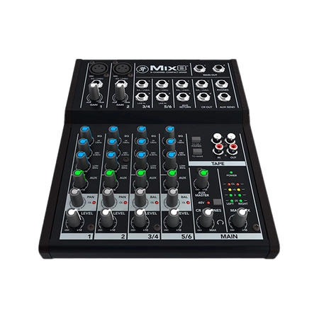 - Mackie MACKIE MIX8 — 2× wejścia mikrofonowe XLR/TRS, 2× wejścia stereo TRS, 3-pasmowy EQ, zasilanie phantom 48V, 1× wyjście AUX, wejście/wyjście RCA, wyjściagłówne L/R TRS, wyjście słuchawkowe z regulacjągłośności, wymiary 198×244×53mm, waga 1,1kg