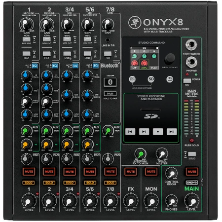 Mikser analogowy z portem USB to najlepsze kompaktowe i niedrogie rozwiązanie do grania live, nagrywania w domu czy tworzenia treści. Mikser Onyx 8 wyposażony został w: 8 kanałów, w tym 4 tory mikrofonowe z legendarnymi preampami Onyx Mic, które zapewniają do 60dB wzmocnienia, funkcje nagrywania wielu ścieżek jednocześnie w wysokiej rozdzielczości 24-bit/96 kHz poprzez USB 8x4 I/O na Mac/PC, potężny procesor DSP z edytowalnymi parametrami efektów i możliwością zapisania własnych presetów, odtwarzacz i rejestrator na kartę SD - 96 kHz / 24-bit 2x2, przejrzysty kolorowy wyświetlacz, wbudowany moduł Bluetooth do bezpośredniego odtwarzania muzyki na kanałach 7/8, Aux send: 1 + FX, globalny zasilacz phantom 48v, filtr górnoprzepustowy 100Hz low cut na kanałach mic 1-4, przełącznik Hi-Z na kanałach 1-2 pozwalający na bezpieczne podpięcie bezpośrednio do miksera gitary lub basu i korekcję Perkins "British style" 3-band EQ z opcją on/off i parametrycznym Mid Freq. Wymiary: 279 x 267 x 115 mm (DxWxH). Waga: 3,2 kg.