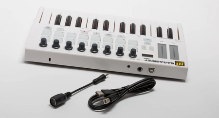 - Miditech MT GARAGEKEY PAD — Mini klawiatura 2 oktawy [PC/ MAC/ iOS], 16 dynamicznych padów RGB, 8 programowalnych potencjometrów, 2 sensory pitch bend i modulacja, arpeggiator, sekcja transport, wyświetlacz OLED, zasilanie USB, gniazdo sustain, integracja