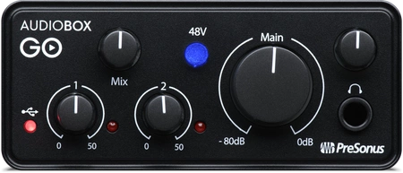 - PreSonus PRE AUDIOBOX GO — Interfejs Audio USB [2 IN/ 2 OUT], ultrakompaktowy, wejście combo [Mic/Line], preamp XMAX-L, wejście instrumentalne TS, wyjście słuchawkowe, 2 wyjścia liniowe TRS, tryb class-compliant [iOS], DAW Studio One