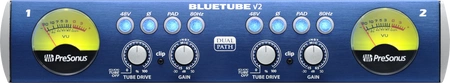 - PreSonus PRE BLUETUBE DP V2 — 2-kanałowy przedwzmacniacz mikrofonowy XMAX z technologią Dual Path [praca w układzie lampowym lub tranzystorowym], regulatory GAIN, DRIVE, przełączniki PAD, filtr 80Hz, faza, Phantom +48V, podświetlane wskaźniki VU