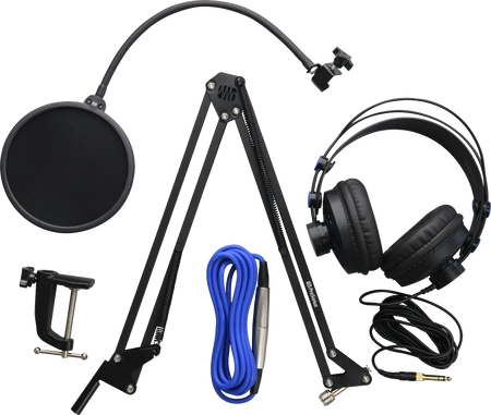 Zestaw do broadcastu, uchwyt radiowy PBA-1 kompatybilny z Revelator, PX-1, PD-70 i innymi mikrofonami, pop-filtr APF-1, słuchawki HD7, kabel XLR 3m, adapter z gwintu męskiego 5/8in. na żeński 3/8in. do użytku ze standardowymi uchwytami mikrofonowymi
