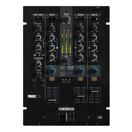 Reloop RMX-33i to 3-kanałowy (3+1) mikser DJ-ski z cyfrową architekturą audio i zintegrowanymi efektami Instant Sound Colour. Ten kompaktowy klubowy mikser charakteryzuje ta sama wysoka jakości wykonania i dźwięku, którą można znaleźć już we flagowym mikserze RMX-80 Digital.