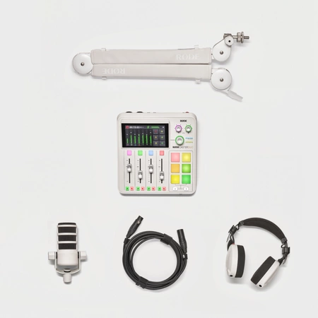 - Rode RODE CREATOR BUN WHITE — Zestaw do produkcji podcastów dla 1 osoby, składa się z konsoli RØDECaster Duo, mikrofonu PodMic, słuchawek NTH-100, statywu PSA1+ oraz kabla mikrofonowego 3m XLR-3