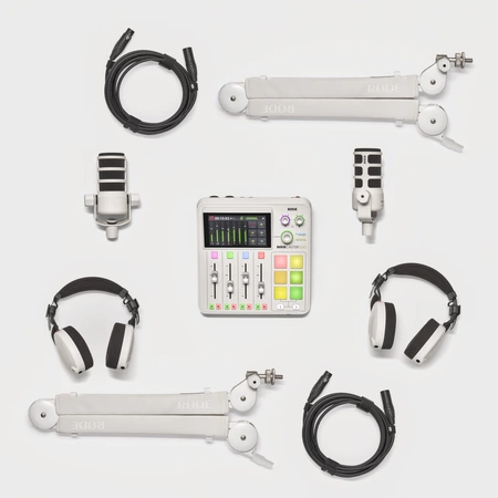 - Rode RODE PODCAST BUN WHITE — Zestaw do produkcji podcastów dla 2 osób, składa się z konsoli RØDECaster Duo, 2 mikrofonów PodMic, 2 par słuchawek NTH-100, 2 statywów PSA1+ oraz 2 kabli mikrofonowych 3m XLR-3