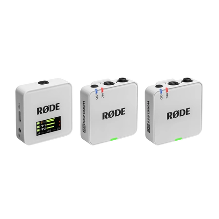 - Rode RODE WIRELESS GO III-W — 2-kanałowy cyfrowy system mikrofonowy z transmisją RØDE Series IV 2,4 GHz szyfrowanie 128-bit, zasięg do 260m, nagrywanie w 32-bitach float, 32 GB pamięci na 40 h nagrań, GainAssist, monitoring słuchawek, czujnik zasilania, w