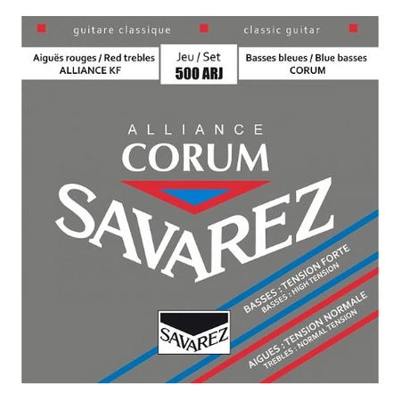 CORUM ALLIANCE RED/BLUE Zestaw strun do gitary klasycznej z serii Corum Alliance. Naciąg hybrydowy: struny wiolinowe - standardowy, struny basowe - twardy, wiolinowe z tworzywa Alliance KF, basowe na tworzywie Corum z okrągłą owijką posrebrzaną.