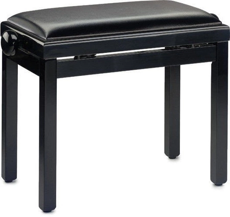 Siedzisko o wymiarach 53 × 32 cm, pokryte wysokiej jakości czarnym winylem, zapewnia wygodę podczas gry oraz łatwość utrzymania w czystości. Dzięki regulacji wysokości w zakresie 49–59 cm (śruba rzymska) ławę można dopasować do preferencji i sylwetki pianisty.
