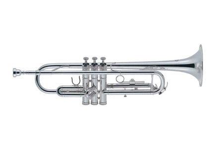 Trąbka uczniowska japońskiej firmy J. Michael.Strój BPosrebrzanaRoztrąb 117 mmMenzura 11,65 mmPierścień przy 3-cim tłokuPodpórka przy 1-szym tłokuW komplecie futerał i ustnik